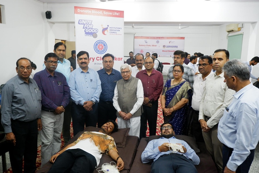 Sobhasaria Group of Institutions, Sikar, in collaboration with the Rotary Club of Sikar, successfully organized a blood donation camp under the aegis of the National Service Scheme (NSS) and the Institution’s Innovation Cell. The camp saw enthusiastic participation from students, faculty, and staff, with a total of 101 units of blood collected for patients in need.